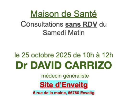 CONSULTATION SANS RDV SAMEDI 25 OCTOBRE SITE D'ENVEITG DE 10H À 12H