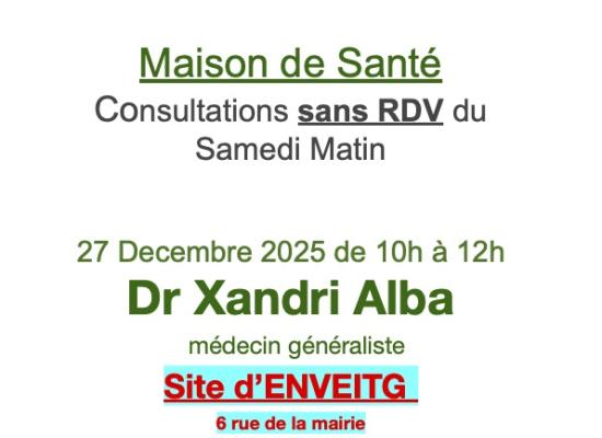 CONSULTATION SANS RDV DU SAMEDI 27 DECEMBRE DE 10H À 12H SITE D'ENVEITG