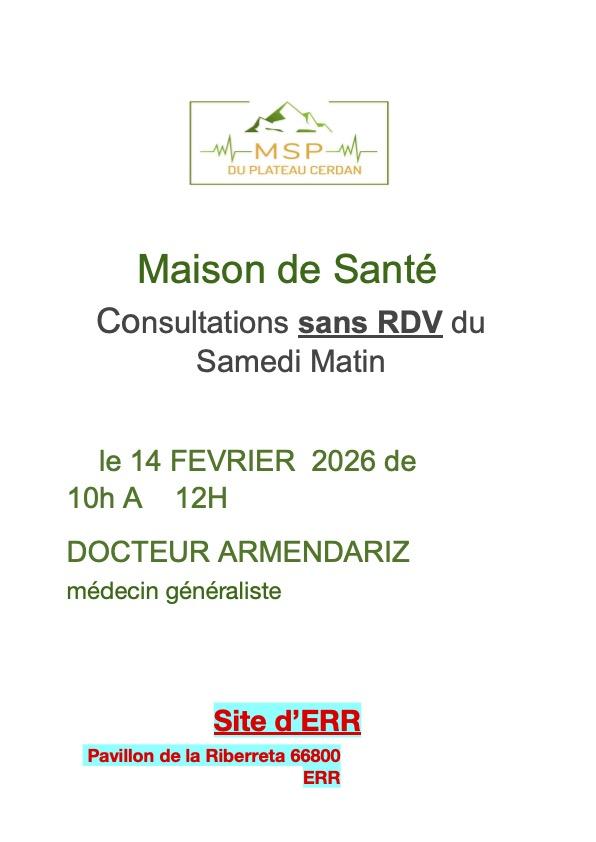 CONSULTATION SANS RDV DU SAMEDI 14 FEVRIER SITE DE ERR DE 10H À 12H